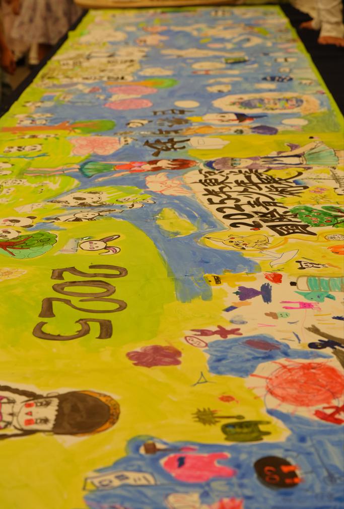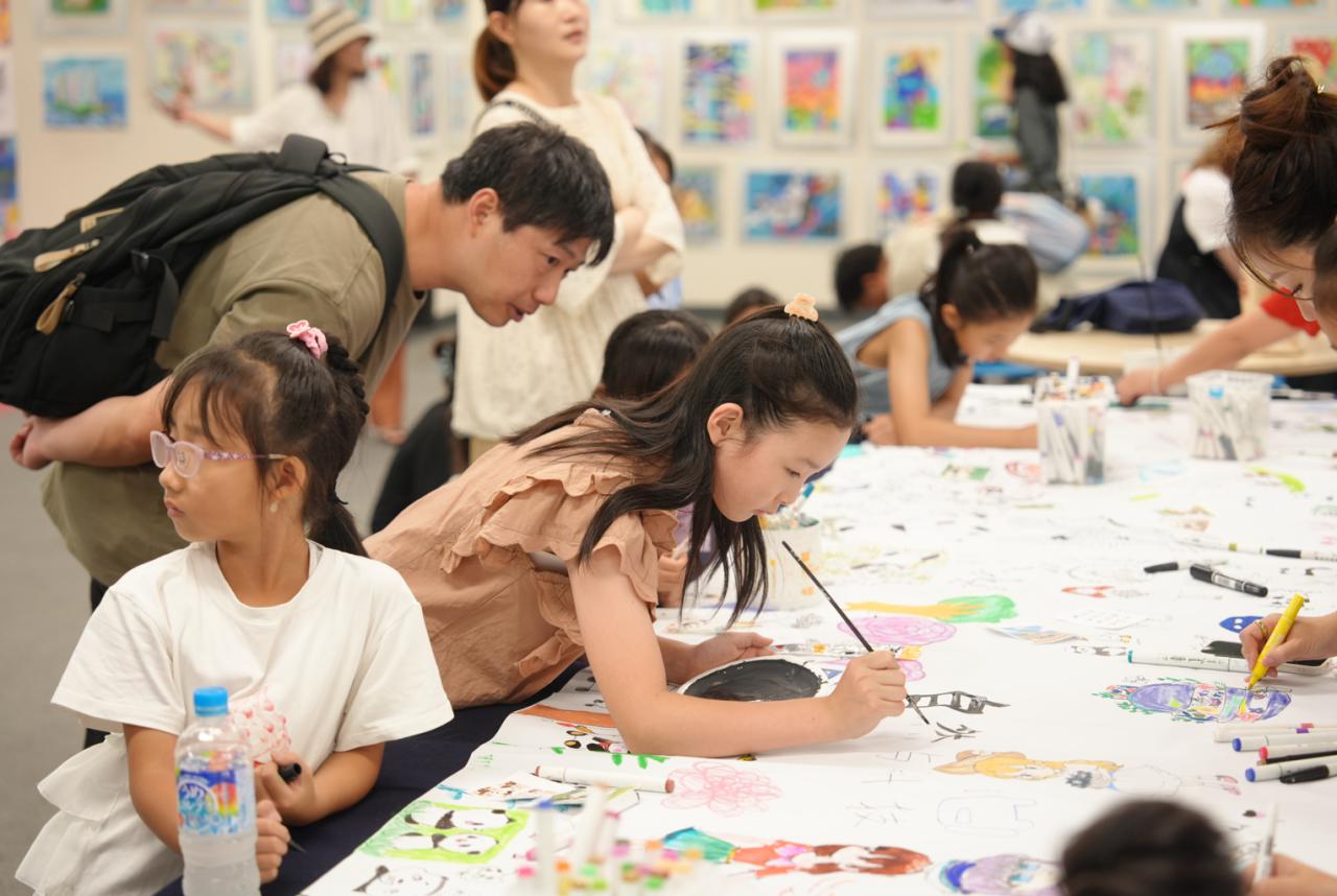 在开幕式当天,我们特别策划了一项意义非凡的活动:中日两国的孩子们在现场共同合作完成了一幅5米大型画作,孩子们在画布上自由挥洒色彩,描绘出心中的未来世界,不仅画出了象征和平的白鸽、手牵手的中日少年,还大胆描绘了他们心中的未来城市、飞行汽车、绿色星球等奇思妙想。他们还用画笔描绘出自己喜爱的各种动物、动漫角色以及童话中的幻想生物,使整个画卷充满了童真与想象的色彩,活泼而温暖。这一巨型合作画卷不仅展现了孩子们丰富的想象力和艺术表现力,更象征着两国青少年心灵相通、共绘未来、守护和平与友谊的美好愿景。正如主办方所言:“艺术是连接心灵的桥梁,也是播种和平与理解的种子。”这幅画卷,无疑成为本届展览最具象征意义的亮点之一。