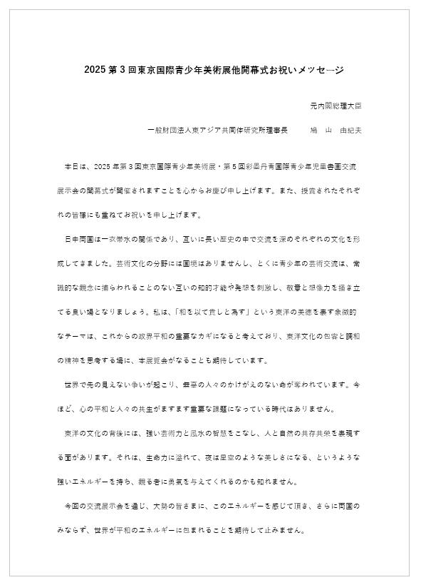 嘉宾们纷纷表示,青少年是未来的希望,而艺术是跨越国界、连接心灵的重要桥梁。他们高度评价本届展览在促进中日青少年文化交流、激发创作潜力方面发挥的积极作用,鼓励更多年轻人以艺术表达对世界的观察与思考。第93任日本内阁总理大臣鸠山由纪夫也为本次展览送上贺词。他在贺词中表达了对中日民间友好事业的深切关注,并称赞青少年们的艺术作品“充满创造力、希望与和平的力量”,希望通过这样的文化交流活动,进一步增进两国人民之间的理解与信赖。