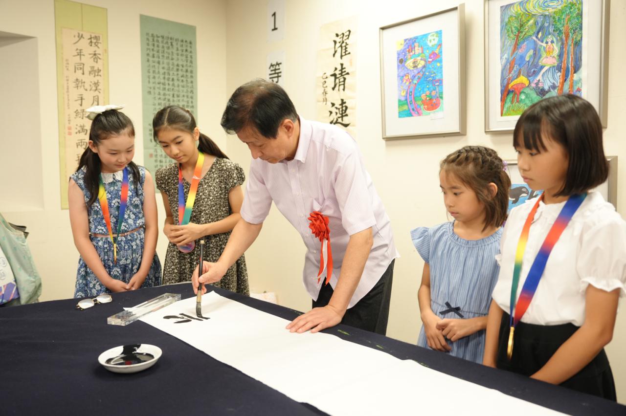 授奖仪式后组委会还特别邀请了重量级艺术家著名旅日书法家晋鸥老师、知名画家王子江老师以及日本华人文联主席晋鸥与青少年现场互动交流。